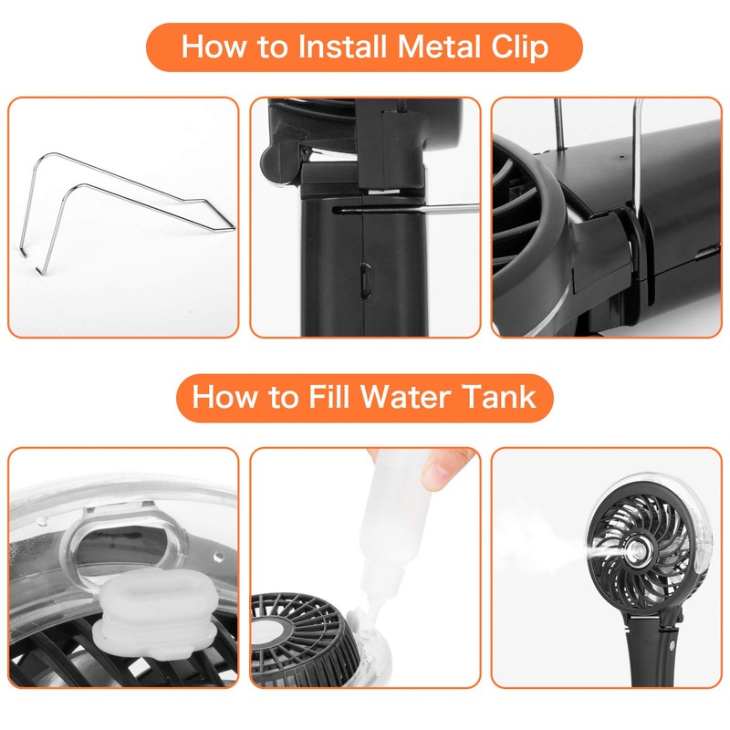 **COMLIFE Portable Misting Handheld Fan** \-- Your Best Companion in This Hot Summer! **Multifunction -- Fan + Humidifier + Light** The fan, misting and night light functions can work separately or together. Used as a misting fan, it helps to last your makeup, keeping skin fresh or cooling after exercise. While the unique colorful LED light helps to create atmosphere, you can use it at the concert or used it as a nightlight while sleeping. **Handheld, Desk & Clip Fan 3 in 1** **Handheld Fan** Small size(8.86*4.13*1.46) and light weight(0.42lb). It’s easy to carry with you by holding in hand or put in bag while going outdoor. **Mini Desk Fan** 180°foldable feature allows the fan to stand on desk. You can use it at home, in office or classroom. The cool breeze will makes you more comfortable while study or working. **Clip Fan** With a metal clip, the fan can be fixed on desktop, shelf or baby stroller. **Specification:** Input current: 5V/1A Working time: 2-13H Charging time: 3 hours Battery: 18650 lithium ion battery(built in and irreplaceable), 2000mAh **Mode Indicator Light:** Red: fan mode Green: mist mode Yellow:fan+mist mode **NOTE** * When you hang the fan upside down, the mist mode won’t work because of the special shape of water tank. * Before refill water, please turn off the fan, mist and light to prevent the fan from getting wet and short circuit. **Package Contents** 1* Handheld fan 1* Metal clip 1* USB Charging cord (80cm) 1* Water bottle 1* User Manual
