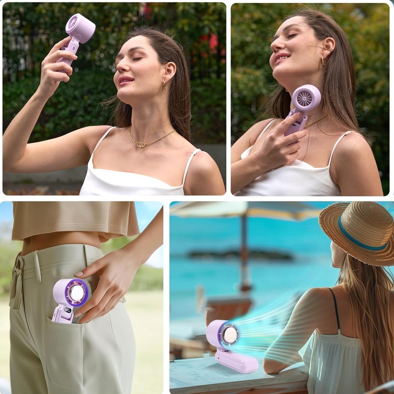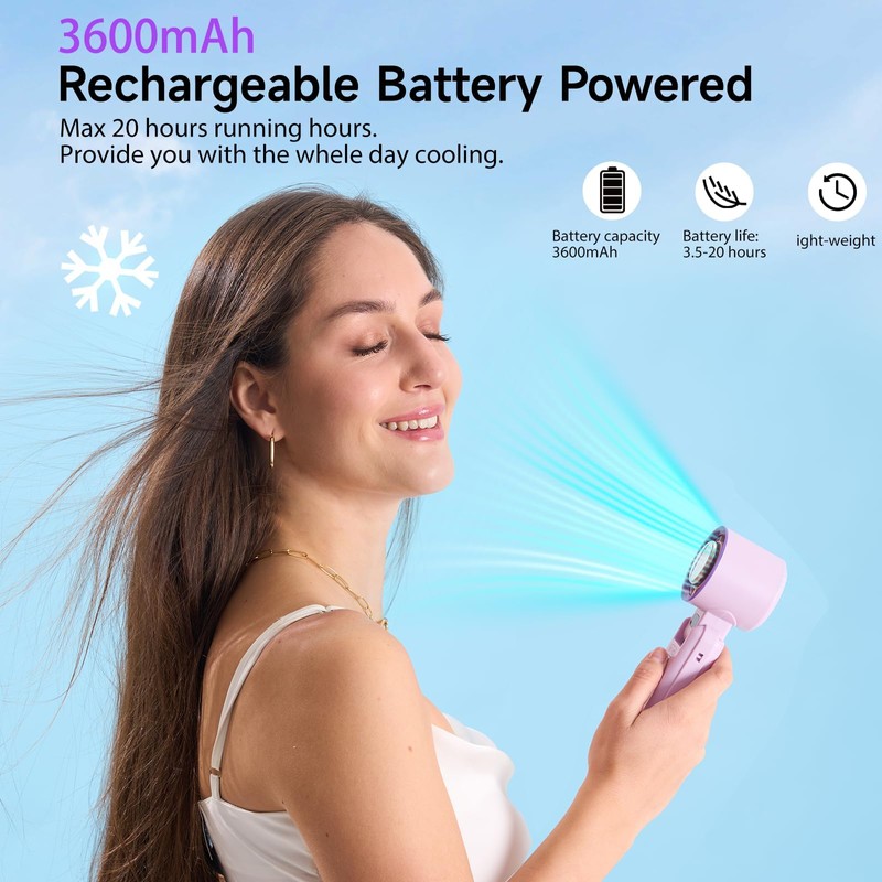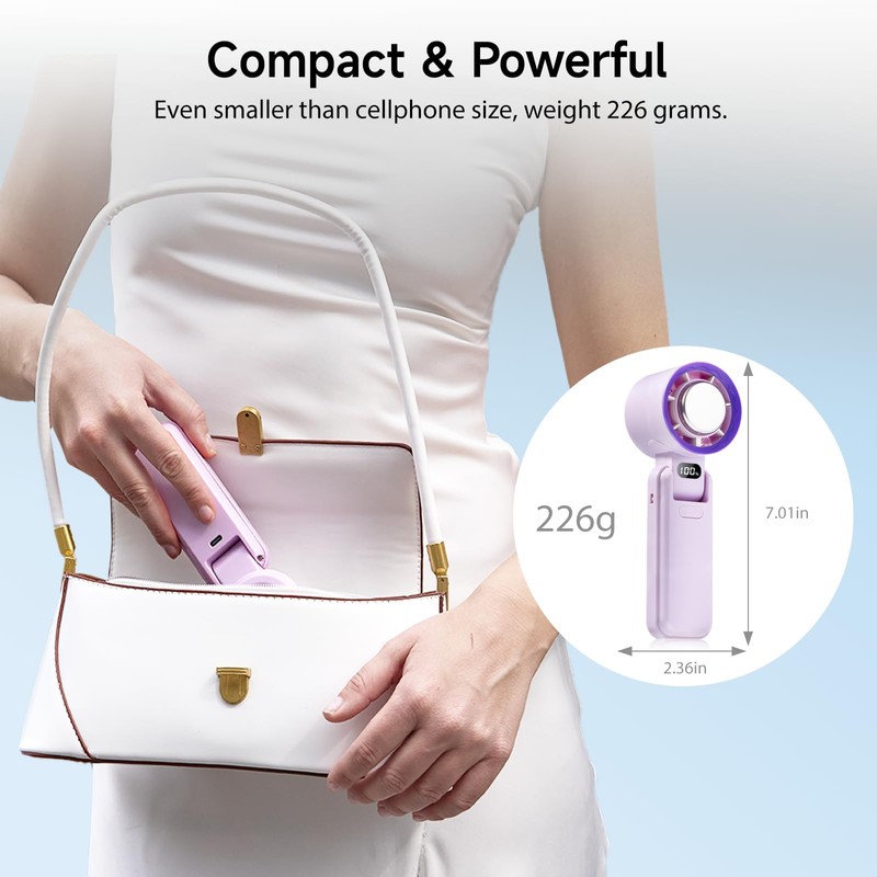 - Foldable & Portable Design: Our rechargeable handheld fan is exceptionally lightweight at just 0.51lb (230g) and measures only 7 inches which makes it perfect for on-the-go cooling. Its sleek and refined design makes it a perfect portable mini fan that fits effortlessly into your bag, backpack, or pocket. Whether you're on a busy commute, relaxing at home, or enjoying outdoor activities, it delivers a refreshing gust to cool you down.