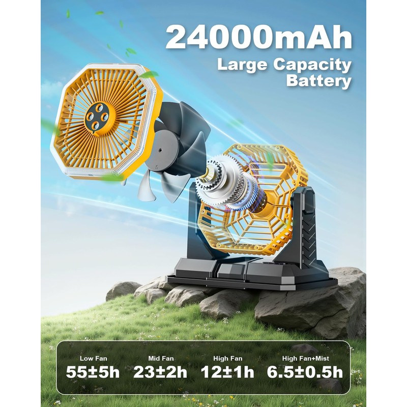 - 24000MAH BATTERY POWERED FAN: This portable fan battery operated is equipped with a 24000mAh rechargeable battery with a working time of 14h-25h-40h-60h and four adjustable speeds, Allowing you to stay cool for a long time, In addition, The fan battery operated is equipped with Type-C input/output and USB output port, Which is convenient for charging the cordless fan, Making it a great choice for camping trips, Power outages, Hurricanes, Etc.