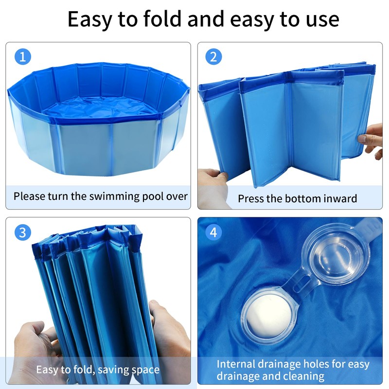 - Easy to Use Pet Pool: No need for inflation. Spread the swimming pool for dogs and then fill in the water; Our pet pool come with in-built drains which makes filling and draining a breeze, Don't forget to trim your dog nails before getting in the foldable dog pool