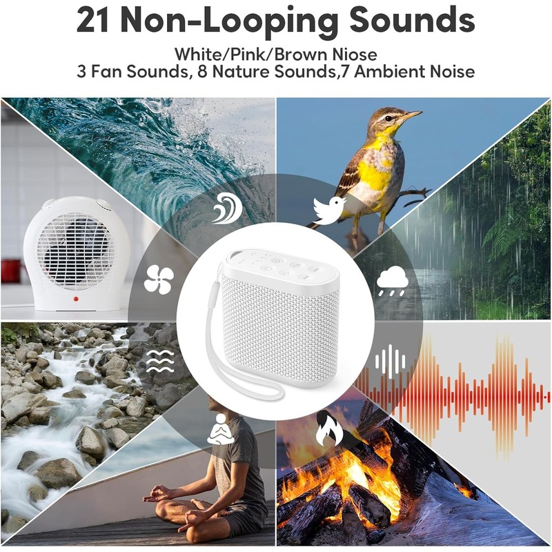 - 【21 Soothing Sounds】Find your perfect sleep soundtrack with 21 different non-looping sounds, including white noise, pink noise, brown noise, fan sounds, rain, ocean waves, campfire, birds, and more. Find your favorite and enjoy a restful night