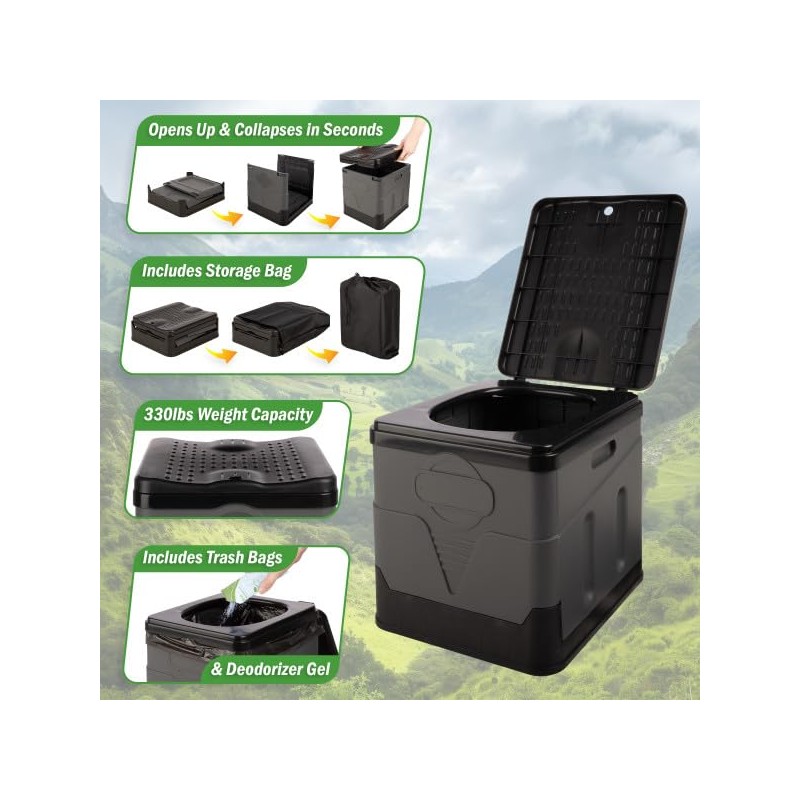 - PORTABLE TOILET FOR CAMPING - This portable potty for adults is a must-have addition to your camping gear. The camp toilet comes with (12) 25-liter toilet bags and 12 packs of biodegradable lemon-scented deodorizer gel to control smells.