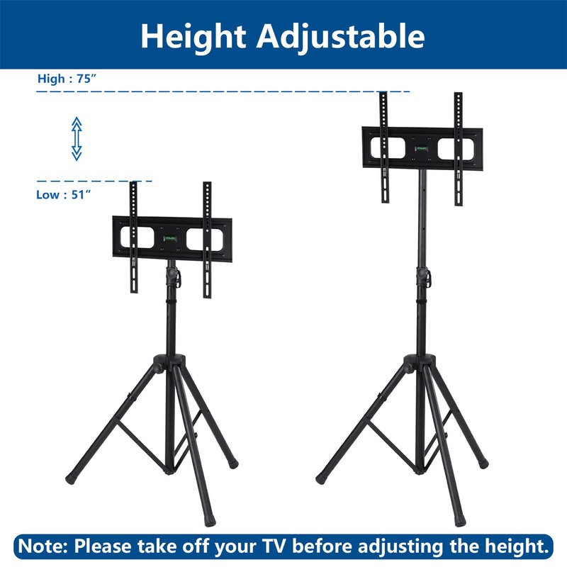- 【ADJUSTABLE TV STAND】-The pole support and tripod legs are all adjustable for optimal viewing height. Its height can be easily adjusted from 51" to 75" off the floor with A tool-free knob. To add safety for your TV, a security pin is used to lock the tv stand at a comfortable height, protecting it from falling, sliding, or wiggling during use.