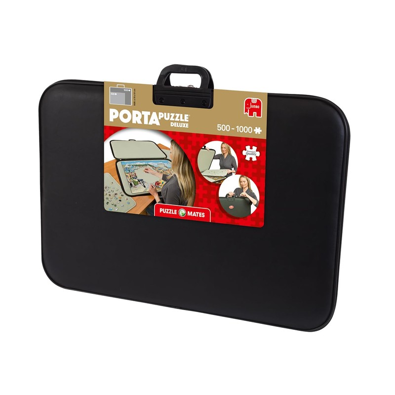The Portapuzzle deluxe is a fantastic way of storing and transporting your favourite jigsaw puzzles whilst you enjoy completing them. The convenience of the Portapuzzle deluxe is that you can trust the product to store your puzzle pieces securely without them moving about and disrupting your efforts to complete your jigsaws. Because of the convenient size of the Portapuzzle deluxe you can rest it on your lap, work surface, floor or anywhere that you enjoy puzzling. The easy to carry handle allows for comfortable transportation of your jigsaw puzzles whether its around the house or to a friends to enjoy. The black leatherette finish makes this Portapuzzle an extremely desirable and fashionable puzzling accessory for both male and female puzzlers – and allows for easy cleaning which is ideal when storing and carrying your puzzles.