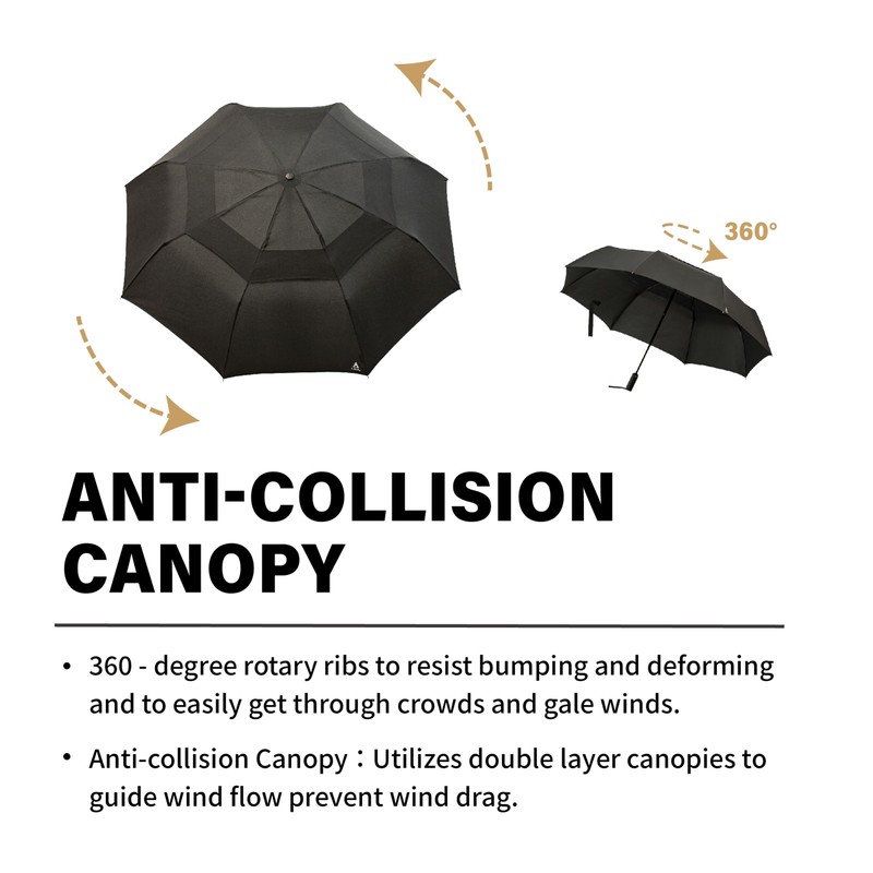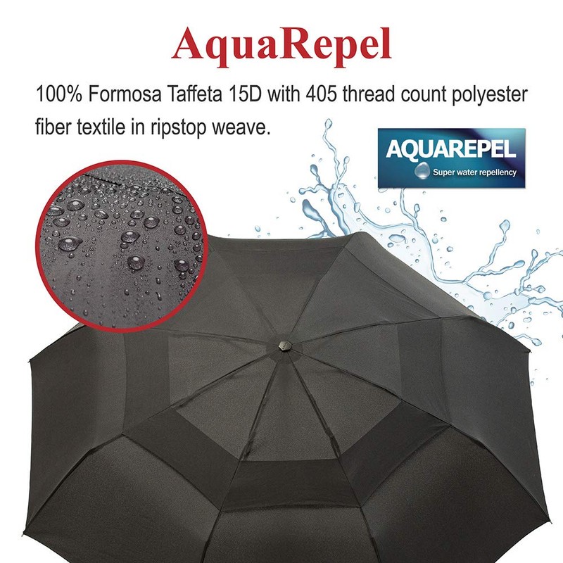 • El mecanismo antichorro también está diseñado específicamente para permitir que el paraguas se abra y cierre fácilmente en un tamañopacto portátil sin sacrificar el tamaño del toldo o el mango. Nuestro toldo doble extragrande de 48 pulgadas y barra de mango triple de 27 pulgadas de largo es el paraguas plegable más grande disponible