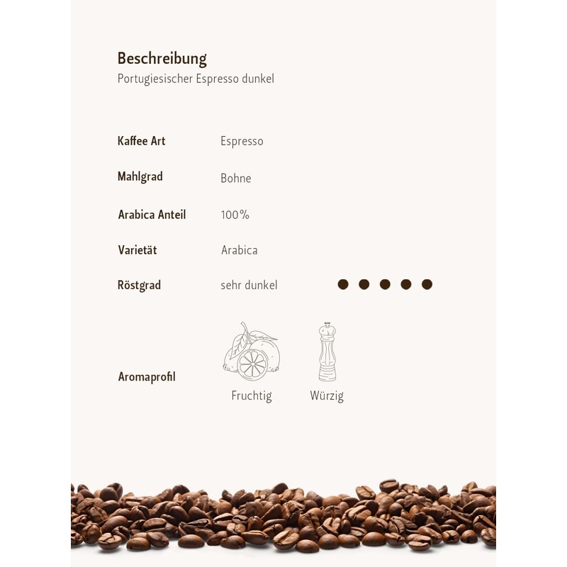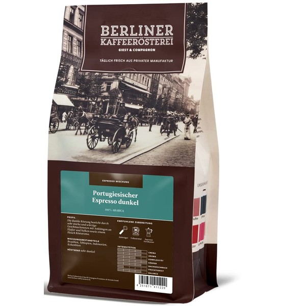 - Contents: Berlin coffee roasting - Portuguese espresso dark (250g/whole bean), roasting degree coffee: very dark, 100% Arabica beans, aroma profile: fruity / spicy