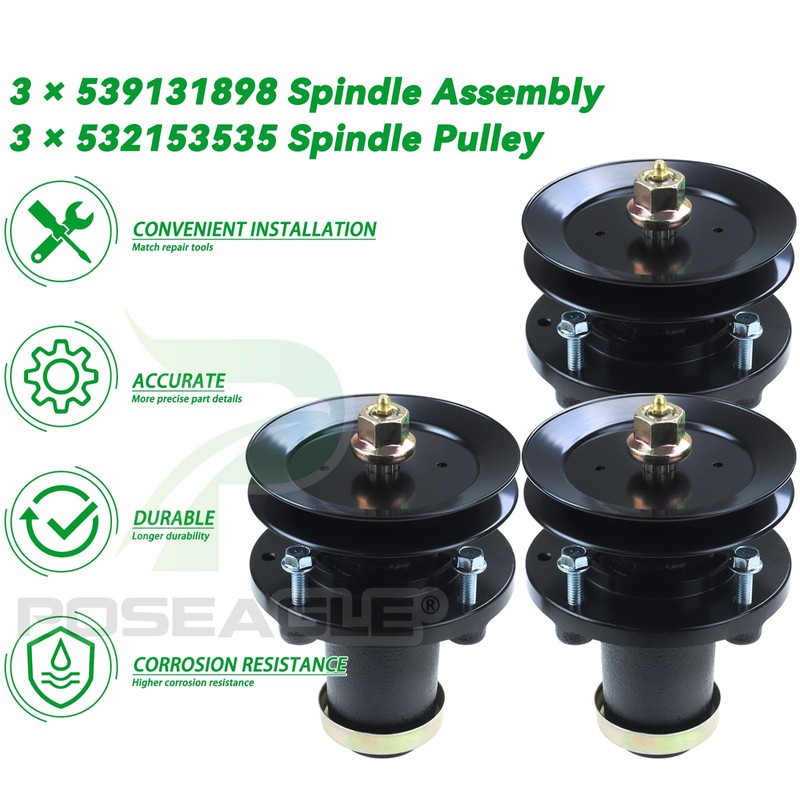 POSEAGLE 3 Pack Pre-Greased 539131898 Spindle with 532153535 Pulley Replaces 539131898, 532173436, 532153535, 532177865, 539112171 for Husqvarna MZT52, Z248F, TS254G, MZT52BF Lawn Tractors