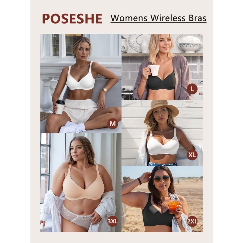 POSESHE Womens Comfortable Bras Wireless Full Coverage Bralettes Seamless Tshirts Push Up Bra with Extender Coffee