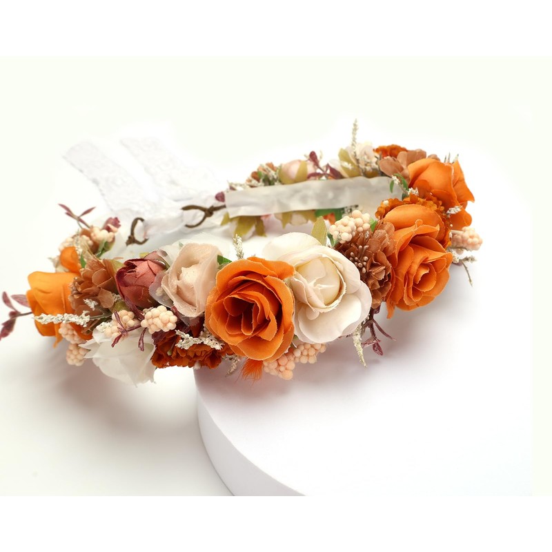 PoshMyra Burnt Orange Flower Crown for Women Wedding Autumn Floral Boho Hair Headpiece Fall Bridal Rusty Wreath Bridemaid Crown Garland Maternity Photo Prop Headband