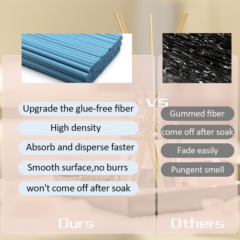 - 【Fiber Material】Fiber diffuser sticks are manufactured for the specific purpose of diffusing oils, and for that reason, this is one of the most efficient materials for absorbing oil. These sticks absorb and disperse the fragrance faster and are of higher quality than the alternative rattan or wood sticks. They do not clog and allow for a controlled rate of fragrance release, making them perfect for your room diffusers