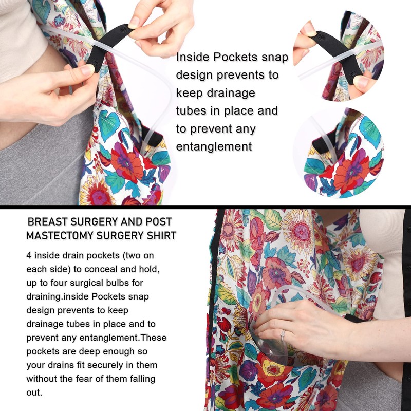 - BREAST SURGERY AND POST MASTECTOMY SURGERY SHIRT : 4 inside drain pockets (two on each side) to conceal and hold, up to four surgical bulbs for draining.inside Pockets snap design prevents to keep drainage tubes in place and to prevent any entanglement.These pockets are deep enough so your drains fit securely in them without the fear of them falling out.
