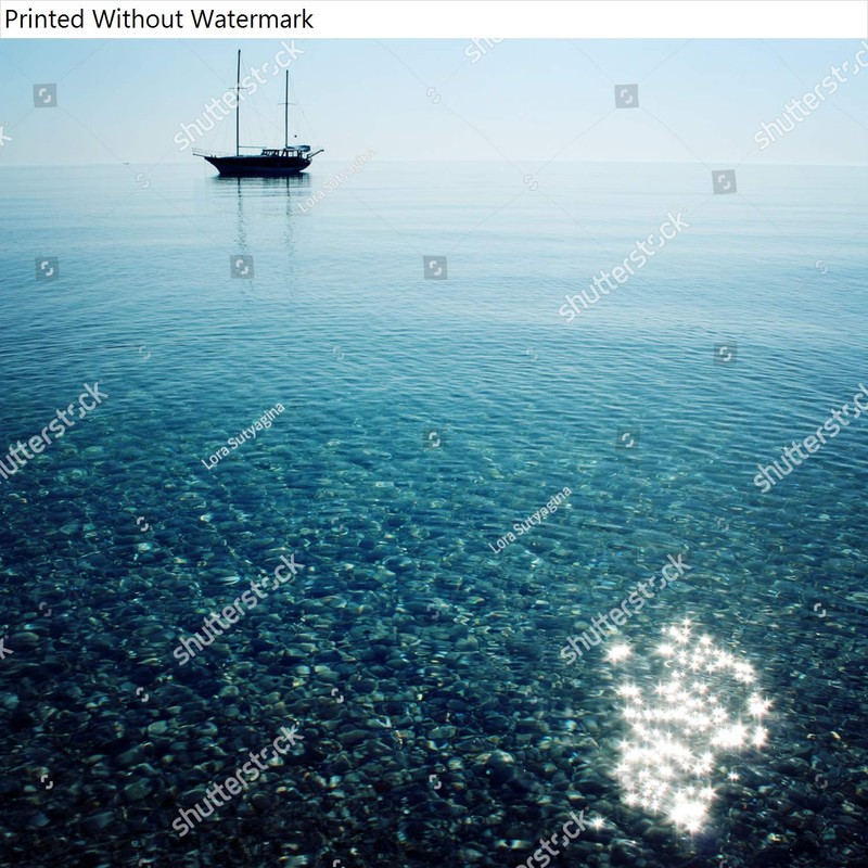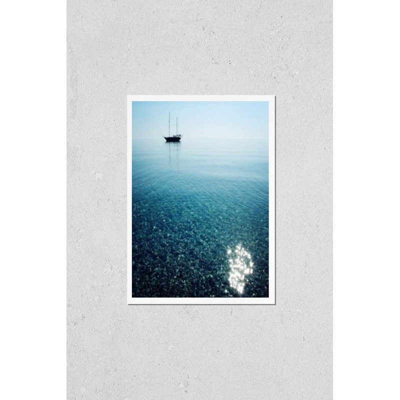 Poster Reproduction of Morning sea with boat on the horizon. Aged photo. Sailing ship profile. Toned image. Sunbeams on the sea surface. Calm Sea with a Sailing Vessel. Cirali, Antalya Province