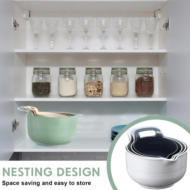 - Nesting Storage Bowls: our mixing bowl with handle and spout has an advantage in saving space, because salad bowls of different sizes can be nested to keep your kitchen neat; These bowls are long lasting and are the necessities in kitchen