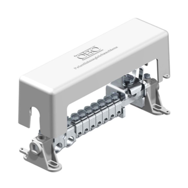 Features: according to VDE 0618, part 1 with clamping rail 10 x 10 mm made of brass, nickel-plated with contact-proof steel terminals, galvanised cover and rail blocks made of polystyrene, grey lightning current bearing 100 kA (10/350) tension bracket with screw locking against self-loosening (e.g. required in industry and ex-areas).