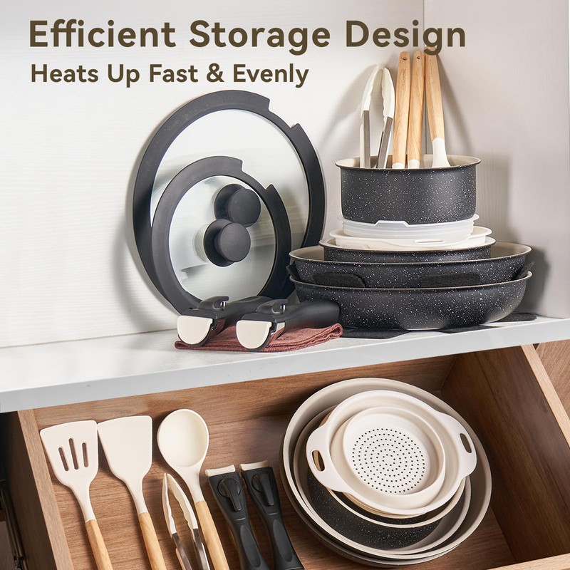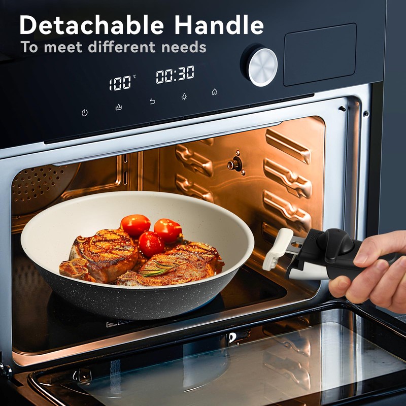 This all-in-one non-stick pots and pans set is designed to meet all your cooking needs. Whether you're frying, boiling, steaming, or baking, the comprehensive range of cookware provides the perfect tools. The detachable handles add to the versatility, allowing the pieces to transition seamlessly from stovetop to oven or fridge. The stackable design not only saves space but also helps maintain a clutter-free kitchen, making it an ideal choice for modern households.