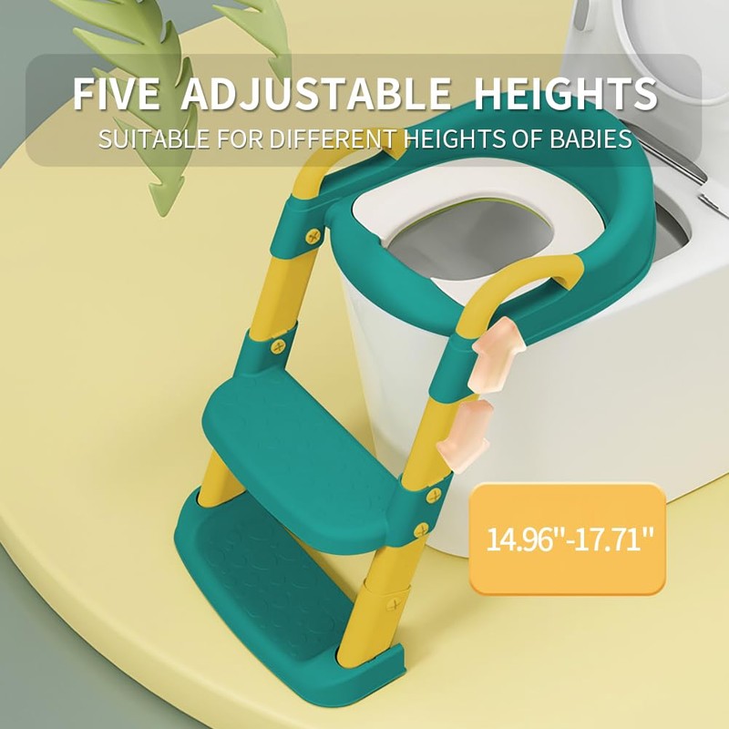 • ADJUSTABLE HEIGHT AND FOLABLE DESIGN: Our kids toilet seat has 5 adjustable heights (from 15 to 17.7 inches) which ensures that it fits 99% of all toilets (like V/U/O shape. NOT for square ), the foldable design allows it maximize the space-saving when not in use and keep everything in order.