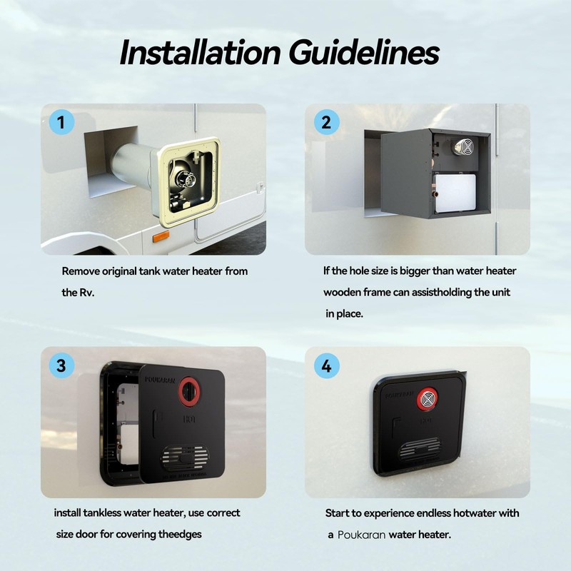 - Reminder: This door is only suitable for Poukaran tankless RV water heaters and cannot be installed on RV hot water heaters from other brands. If you are replacing your Suburban and Atwood water heater, as well as Girard tankless water heaters with a Poukaran water heater. Please install with this product.