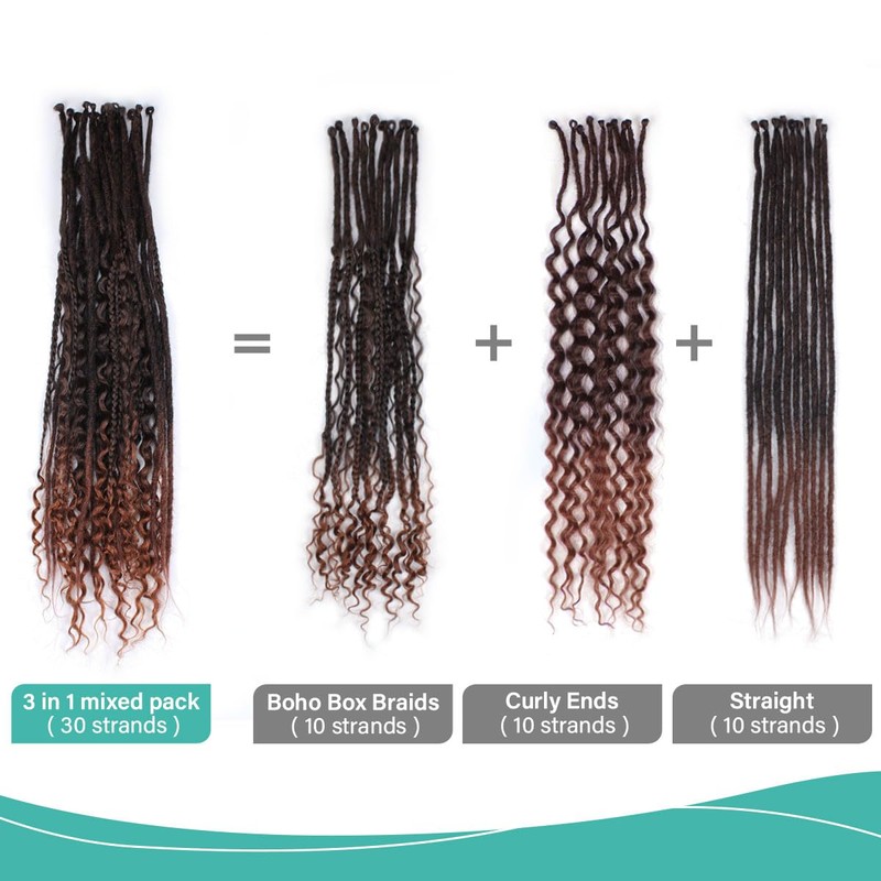 Pouweney 24 Inch 3 In 1 Dreadlock Extensions Sets, 30 Strands Mixed Ombre Auburn Synthetic SE Dreads Extensions, 100% Handmade Soft Single Ended Curly Boho Wavy Dreads for Girls