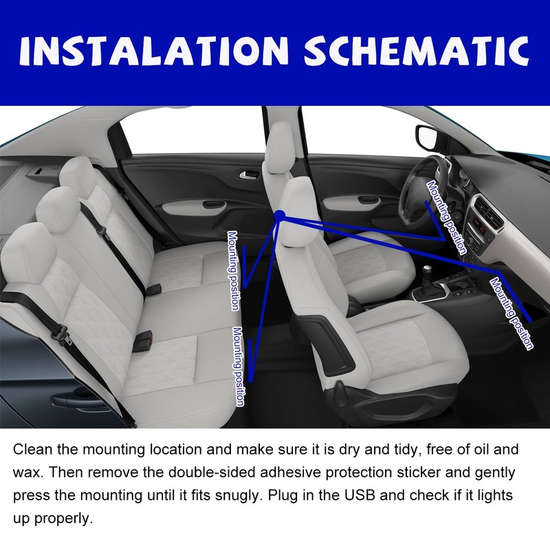 - 【Easy to Install】: It adopts stick-on installation. First, make sure the target area is dry and clean. Then, tear off the protective film of the adhesive backing, attach the light and press gently to stick it firmly. Finally, plug it into the cigarette lighter port or USB port depending on the style.