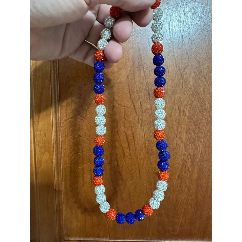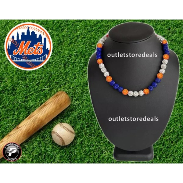 Power Energy Sports Iced Rhinestone Bling Ball Bead Baseball Chain Necklace Orange Blue NY Mets - 24" inches