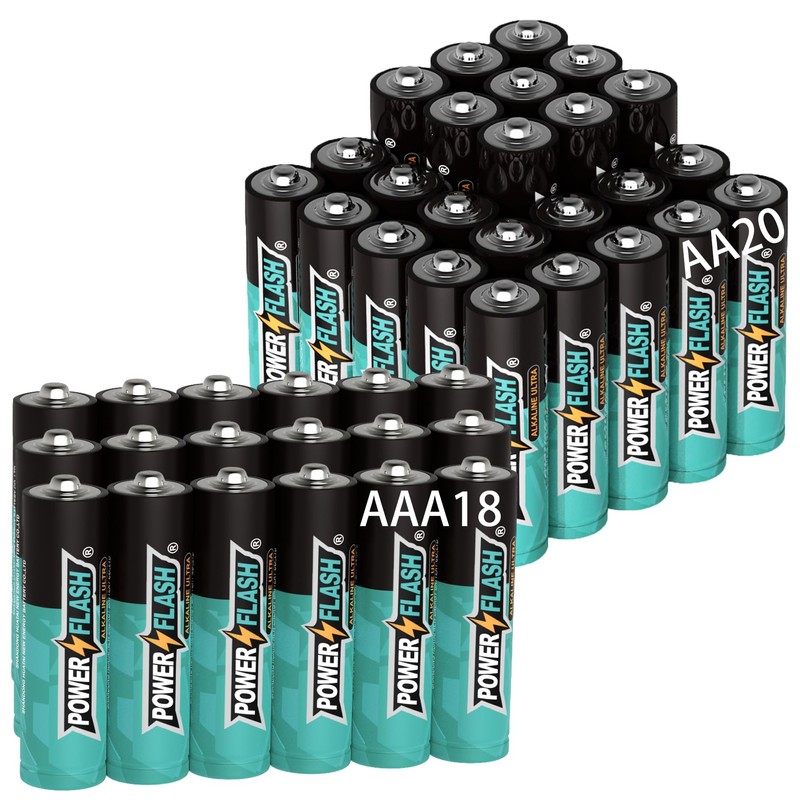 POWER FLASH Alkaline AA20 AAA18 Batteries 1.5V Long Lasting Batteries are Ideal for use in high tech Devices, Clocks, remotes, and Other Household Devices.