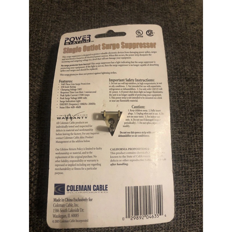 Power Station Single Outlet Surge Protector- Power Station-# 04635-LED Surge Indicator Light-