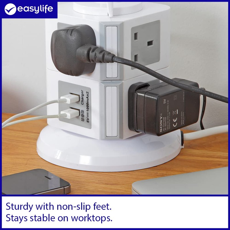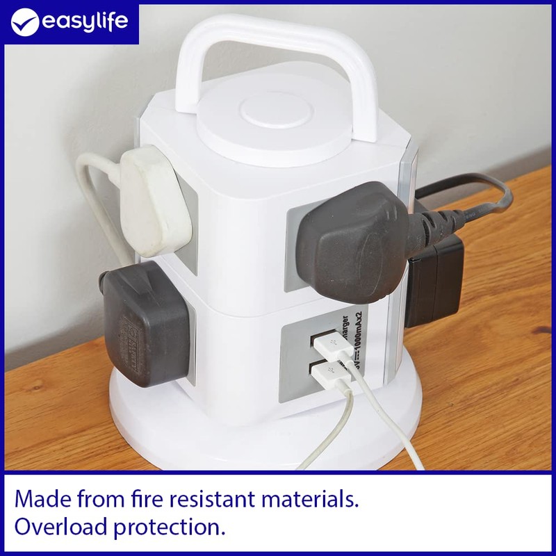 Power Tower 9 | 2 layer tower socket | 7 Sockets & 2 USB Ports | Carry Handle | Features an overload protection | Safely manufactured from fire-resistant materials | Size: Dia 15cm x Height 16cm