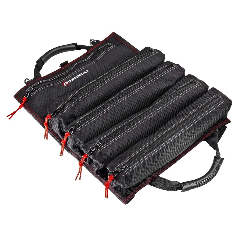 Powerbuilt Pro Tool Bag Roll Organizer, Portable, Great for Off-Road, Heavy Duty 1200D Polyester, 18-1/2 in. x 15 in. Open Size, Hanging Strap, Carry Handle, 5 Zipper Pockets, 14 Wrench Slots