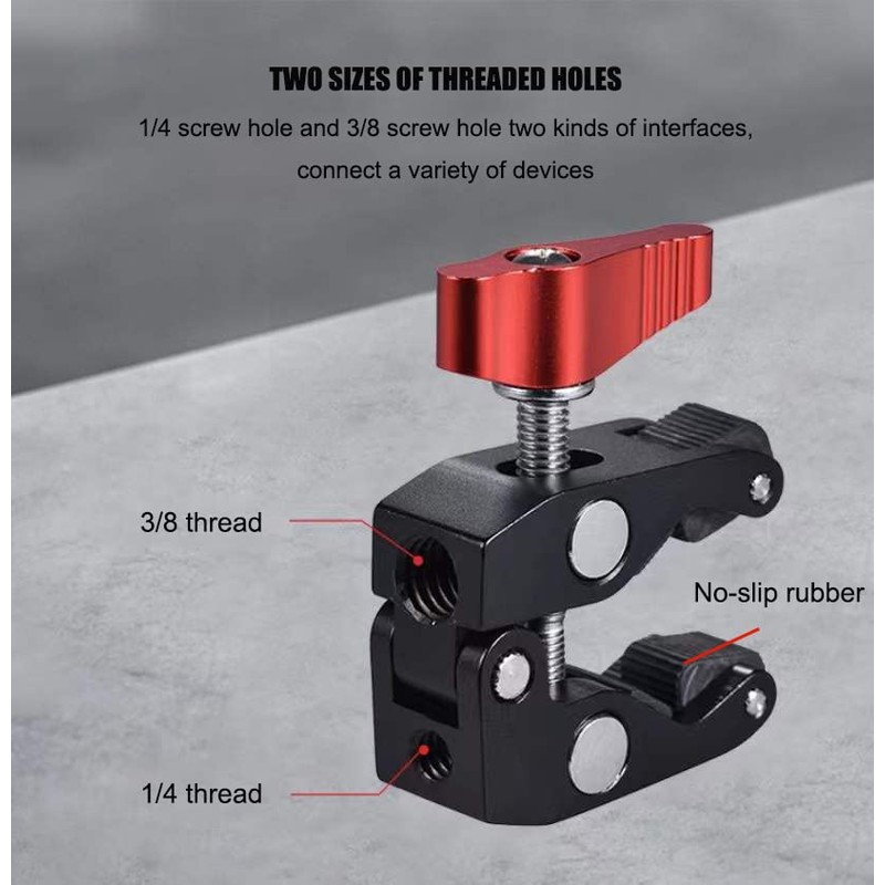 - 【Connect】1/4” and 3/8” female thread on the back-side of clamp help you to to mount a small camera, monitor, LED video light, microphone, speedlite, and more.