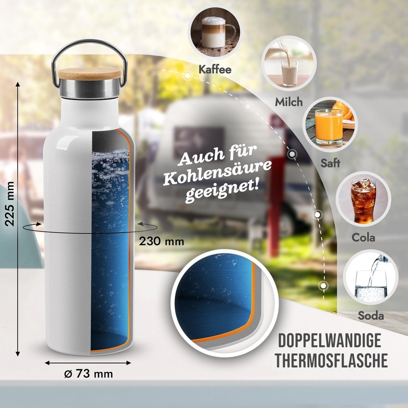 - Durable and sustainable: the drinking bottle not only impresses visually: double-walled insulation - keeps drinks cold or warm - bottle does not get hot from the outside. Rustproof and BPA free, durable water bottle made of high quality stainless steel with leak-proof screw cap thanks to silicone seal. For carbonated drinks, please close well. Environmentally friendly and sustainable.