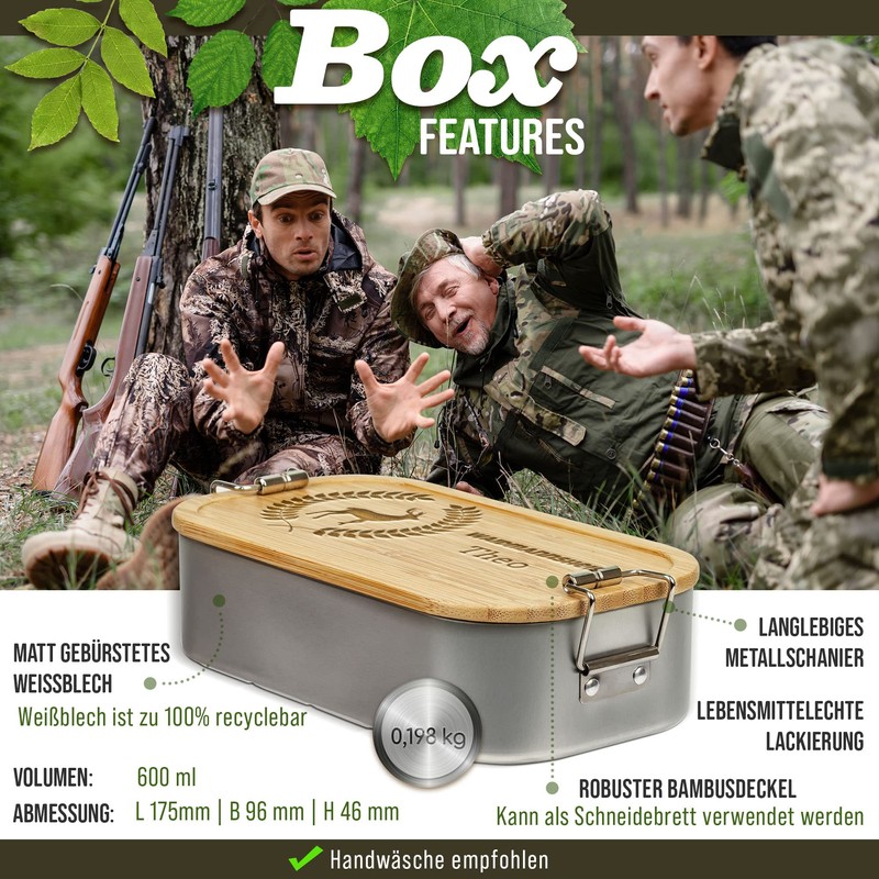 - Individual and sustainable: food-safe, 100% BPA and plastic free. The environmentally friendly and sustainable alternative to the usual storage container. The robust tin plate lunch box with beautiful bamboo lid is perfect for strengthening on the stalking or as a practical storage box for small hunting accessories. The ideal companion for hunting. Practical, handy and suitable for everyday use.