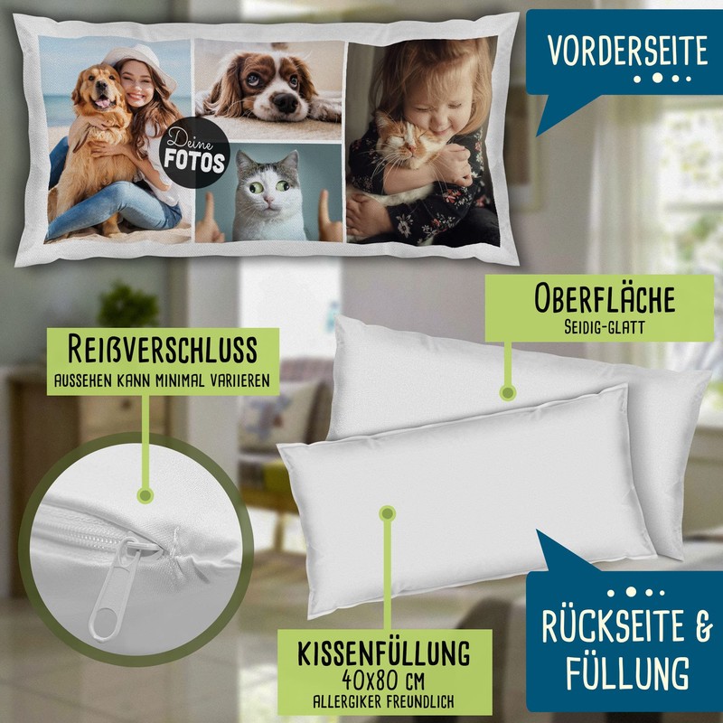 PR Print Royal XXL Cushion with Photo Collage Design Yourself – Customise with 4 Photos – Gift for Friends and Family | White Polyester, Includes Cushion Filling, 80 x 40 cm
