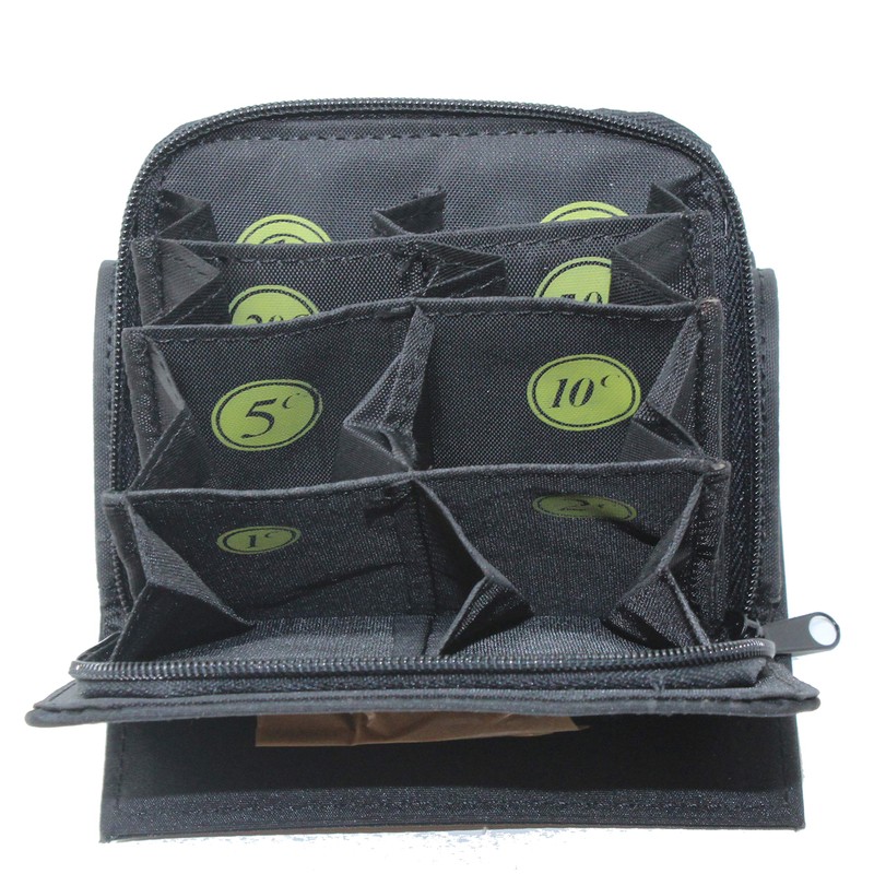 - Press stud wallet section, 12 coin sections, numerous other compartments