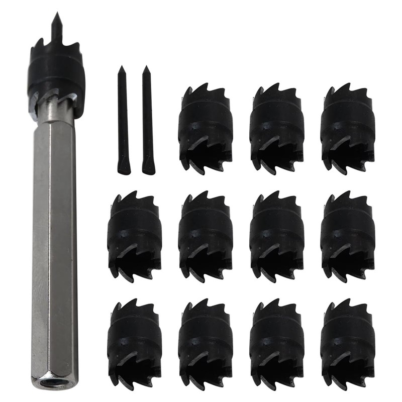 - >> Package includes 1 x Drill with Cutter & 2 x Pilot Pin & 11 x Extra 3/8" cutters.
