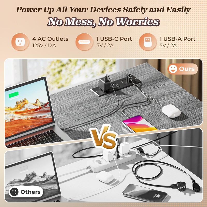 • 【L Shaped Gaming Desk with Charging Station】Charge all your office or gaming devices right at your pc desk: 4 AC outlets, 1 USB-A, and 1 USB-C port handle your laptop, monitor, phone, tablet, speaker, or even a desk lamp – no more crawling under the desk for plugs
