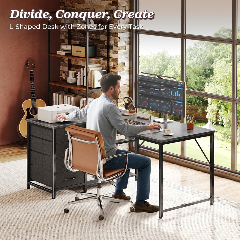 • 【Reversible L Desk with Storage】Utilize your corner space and get 2 distinct work zones with this work desk for home office that adapts to your workflow. Need one side for your laptop and another for your printer, craft projects or gaming setup? This home office desk wraps around you like a command center, giving you more focus than a straight desk ever could. With its reverisble design, this small desk is deal for multitaskers and various home layouts