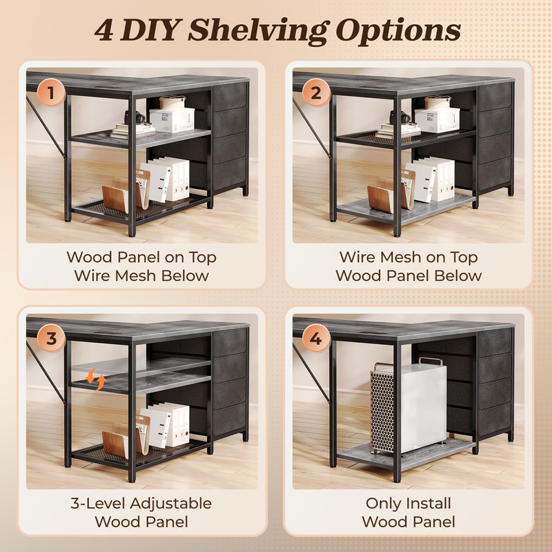 • 【Oversized Desktop & 4-Drawer Storage】Working in a small room? This l shaped office desk offers a wide surface. Main desk fits dual monitors, keyboards, or gaming setups. Side desk holds your printer, notebooks, or a second laptop. 4 fabric drawers and 2 open shelves (adjustable wood & mesh shelf) of the corner gaming desk give you the storage flexibility you need or remove shelves entirely for tower PC space