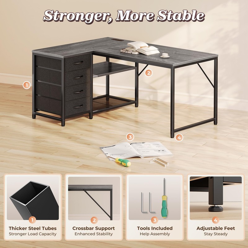 Whether you're working from home, managing your household, studying for exams, or diving into your favorite PC game, this reversible L-shaped studio desk adapts to your daily grind. The wraparound design transforms any corner into a personal workstation, giving you 2 spacious surfaces for multitasking—laptop on one side, printer, drawing pad, or snacks on the other. This corner desk with storage is ideal for small apartments or shared rooms where space and function both matter. Forget bending under the gamer desk to plug in your gear. With 4 AC outlets, a USB-A, and USB-C port built right in, this modern desk powers everything from your MacBook and monitor to your phone, tablet, or lamp—all within arm’s reach. Need storage? You’ve got it. With 4 fabric drawers and 2 open shelves (adjustable wood and mesh), there’s room for paperwork, office supplies, gaming gear, or kids’ homework essentials. Or remove the shelves to make space for a PC tower. Underneath, the sturdy steel frame holds steady while offering generous legroom—perfect for stretching out or sliding in a file cabinet. Assembly’s a breeze with clearly labeled parts and tools included. Whether it’s your home office, dorm, or creative studio, this desk is built to keep up with your lifestyle.