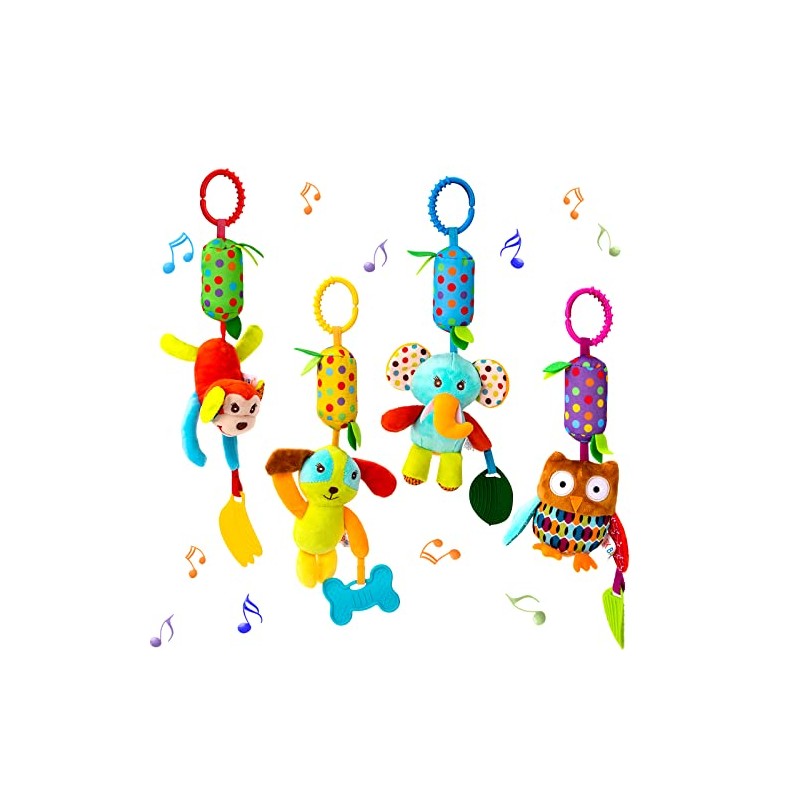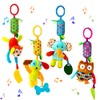Pram Toys for Baby 0-6 Months, Soft Plush Sensory Hanging Toys with Rattles Teether, Clip on Pushchair Stroller Cot Car Seat, Travel Toy Gift Set for Newborn Toddler (4 pack)