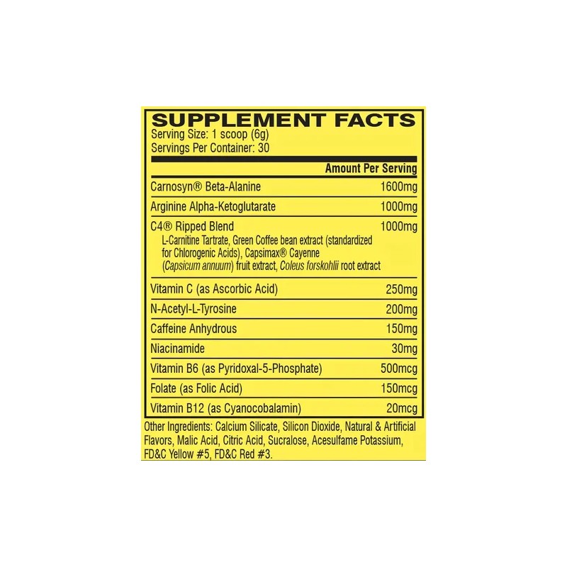 🎯 Ingredientes clínicamente respaldados: Beta-alanina (CarnoSyn®), Arginina AAKG, mezcla C4 Ripped + vitaminas del complejo B