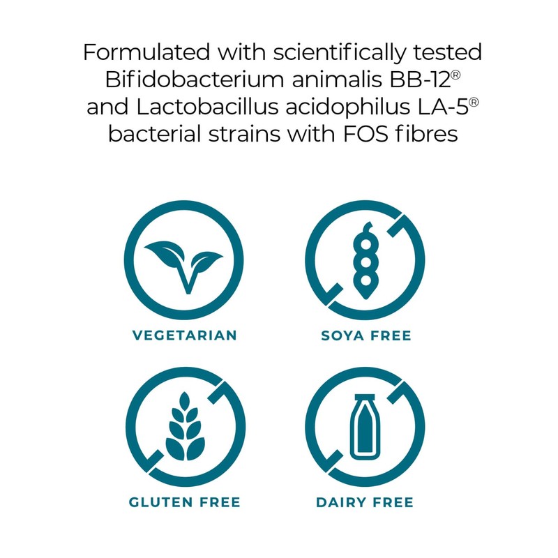 - UNIQUE BACTERIA STRAINS: Formulated with 4 billion CFU of the scientifically studied Bifidobacterium BB-12 and Lactobacillus LA-5 bacterial strains. It also contains FOS (fructooligosaccharides), which acts as food for the bacteria in the gut.