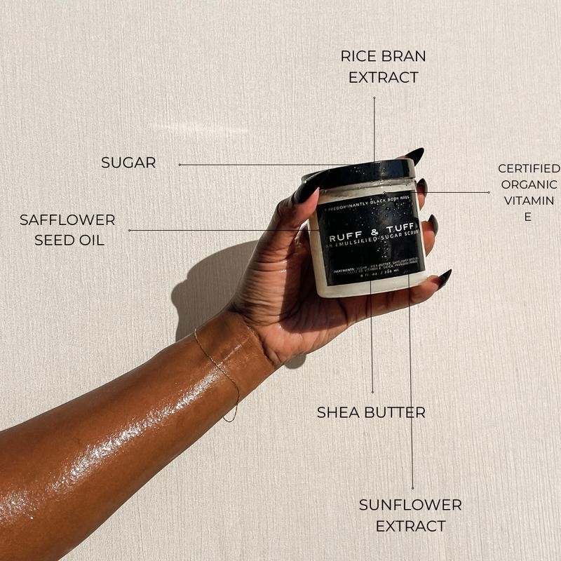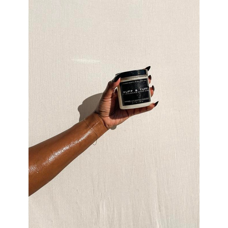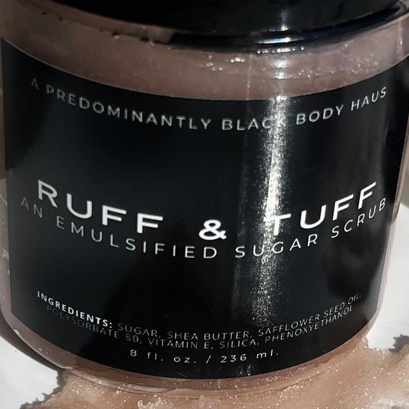 ABOUT: RUFF & TUFF is our Shea Sugar Body Scrub it is mild enough to be used daily and provides a luxurious exfoliation with a non-irritating blend of pure cane sugar crystals and skin-softening oils. This scrub does not lather but does moisturize.