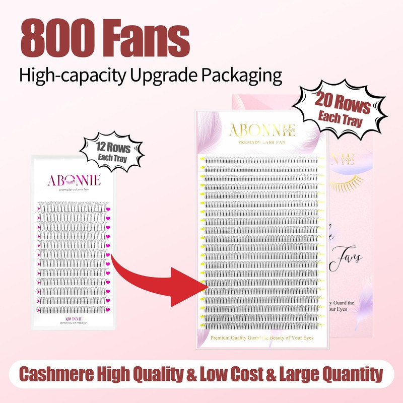 - 【Time Saver & Upgrade Pack】Compared to easy fan lashes, ABONNIE pre-made lashes are more time efficient as you don't have to spend time blooming lash. These pre-made fans can be used by beginners and professional lash artists. We offer lashes with different fans from 3D to 20D and different lengths from to meet your needs in terms. Each lash tray has 20 rows, which is 3 times the quantity of regular packages, making it more affordable and durable!