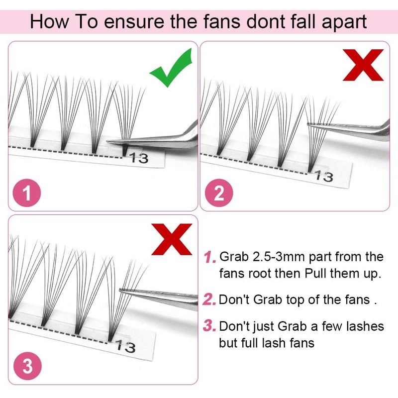 - Special Techniques for Roots : PRO pre made volume eyelash extensions use an unique double-heated bonding method to ensure the eyelash extension would not fall apart when take the fans off strip. The root of fan lash extensions are really tight and thin to be unnoticeable.