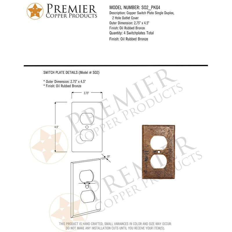 Premier Copper Products SO2_PKG4 Copper Switchplate Single Duplex, 2 Hole Outlet Cover - Quantity 4, Oil Rubbed Bronze