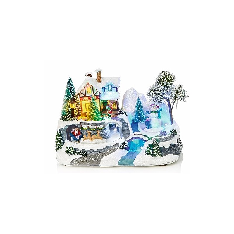 Large LED Light Up Christmas Animated Traditional Village Snow Scene with Three Rotating Turntables - Snowman with Santa Sleigh and Reindeer