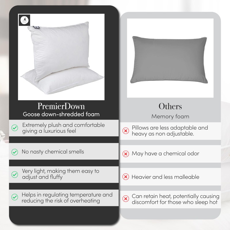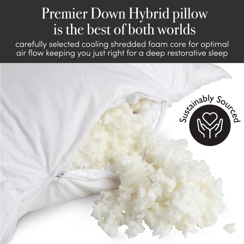 - HYBRID DESIGN FOR OPTIMAL SUPPORT & SOFTNESS: The PremierDown Hybrid Pillow combines the supportive benefits of a shredded orthopedic foam core with the plush feel of a goose feather and down blend. Experience the best of both worlds—supportive yet luxuriously soft.