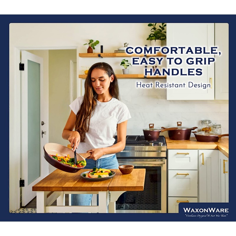 - SAFETY FIRST - No more burning your hands on cookware! Our design features stay cool handles so you can easily maneuver your pots and pans, even under high temperatures preventing any accidental burns. The pot set's sleek wooden design is unrivaled! Our coated pots and pans set is also designed to provide even heat distribution so your food cooks evenly. The non stick cookware set features a long-lasting, durable aluminum body that heats up quickly. Get the perfect cooking results every time!