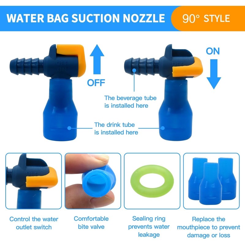 ● Mouthpiece: ON/OFF Shut Off Valve allows you to easily control water flow with the yellow lever. Compatible with drinking tubes and bite valves of most hydration bladders.