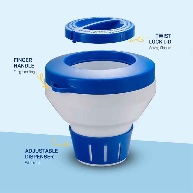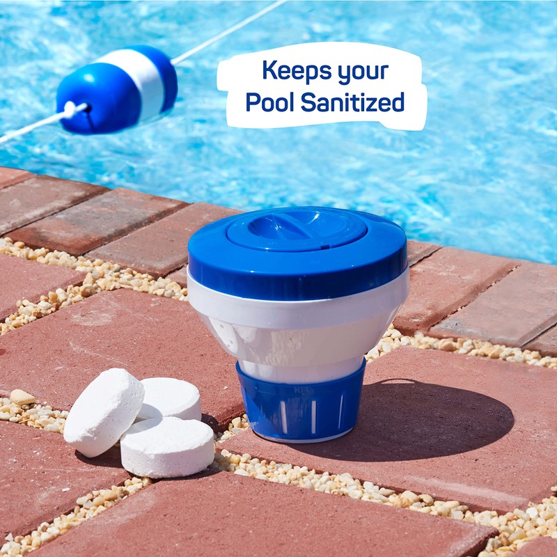 - FLOATING DISPENSER: Includes chlorine floater that holds up to three 3” chlorine/bromine tablets. Unlike other brands, it floats on top of the water without sinking.